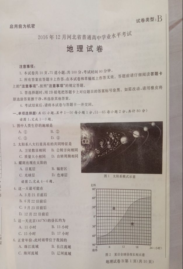 河北省2016年12月普通高中學業(yè)水平考試地理試題、河北省普通高中2016年12月學業(yè)水平考試地理試題