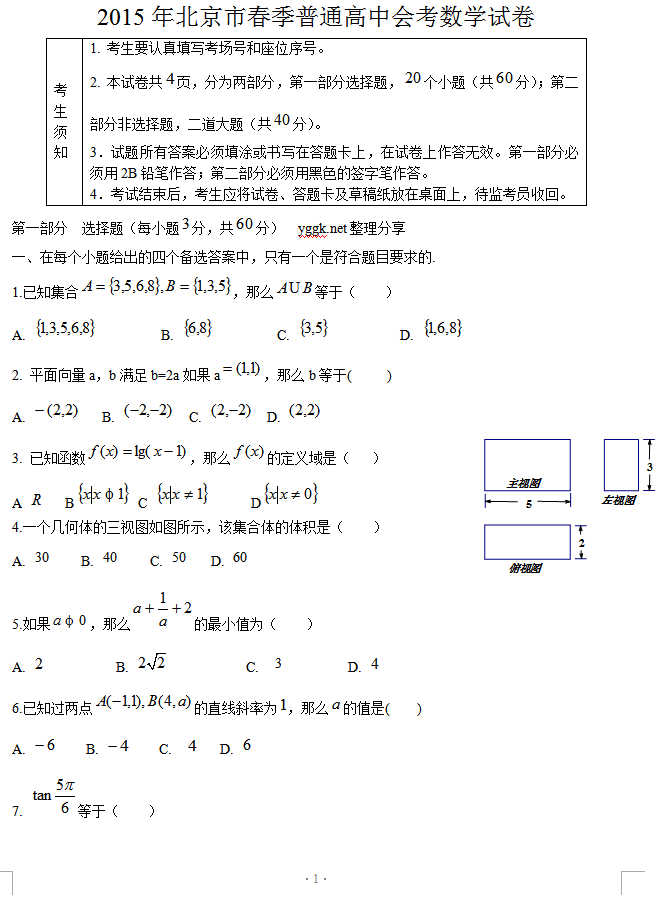 北京市2015年春季普通高中會考數(shù)學(xué)試卷及答案