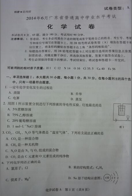 2014年6月份廣東高中學(xué)業(yè)水平考試化學(xué)試題及答案