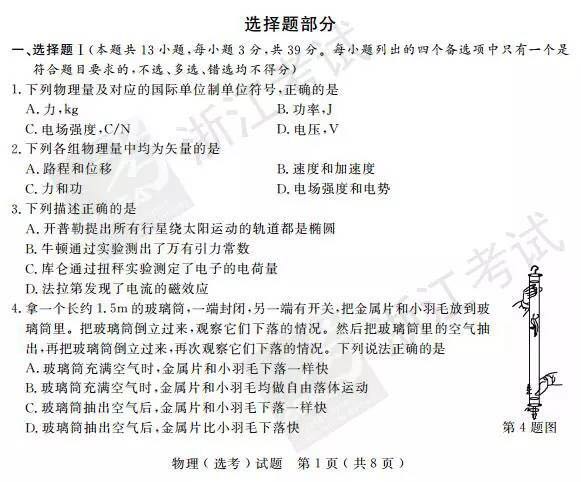 浙江省2017年4月高中學業(yè)水平考試物理試題及答案